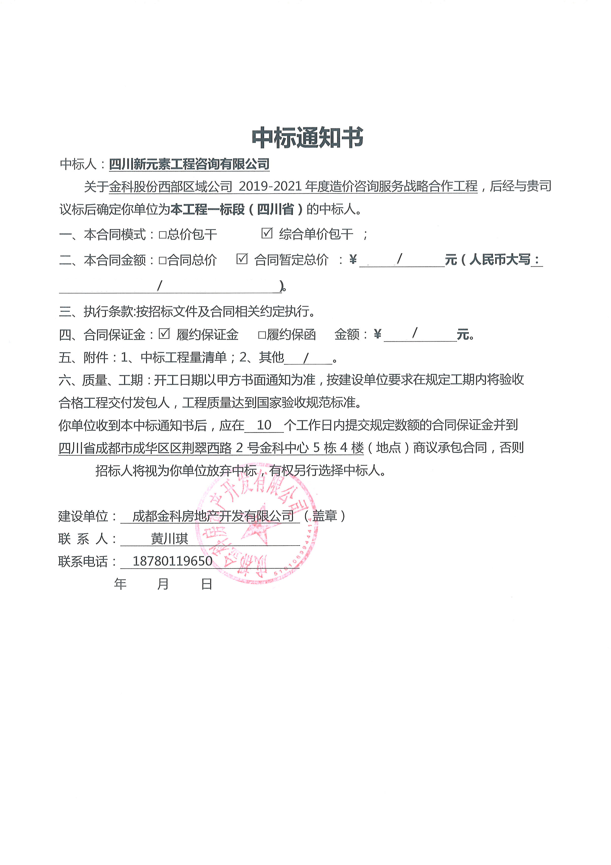 祝贺我司中标金科地产2019-2021年度造价咨询战略合作机构